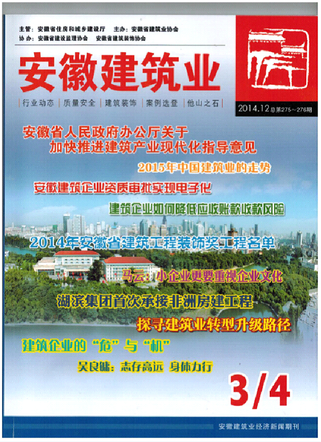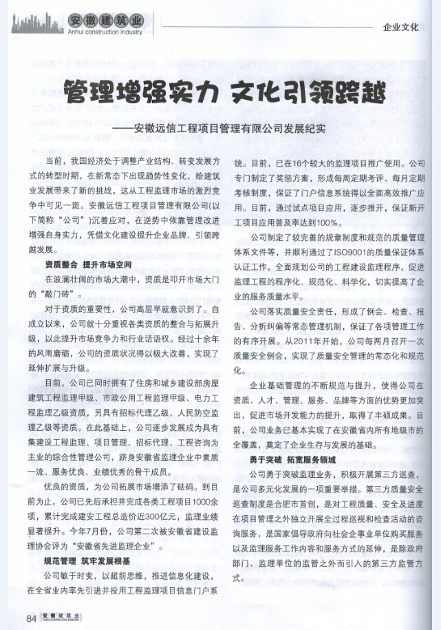 由安徽省住建廳主管、省建協主辦的省級行業主流媒體《安徽建筑業》雜志在最新出版的2014年12月刊中,重點刊發了公司發展紀實的專題文章,全面展示了公司發展成果,體現了企業的良好風貌,提升了企業形象和文化軟實力。文章分為資質整合提升市場空間、規范管理筑牢發展根基、勇于突破拓寬服務領域、文化引領塑造優秀品牌等四個篇章,全文如下: