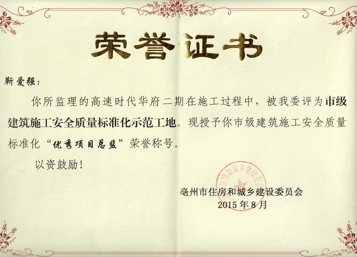據悉,亳州市住房和城鄉建設委員會公布了“市級建筑施工安全質量標準化示范工地”和“優秀項目總監”獲獎名單,公司負責監理的亳州市高速時代華府二期工程和項目總監靳愛強分別名列以上兩項榜單。