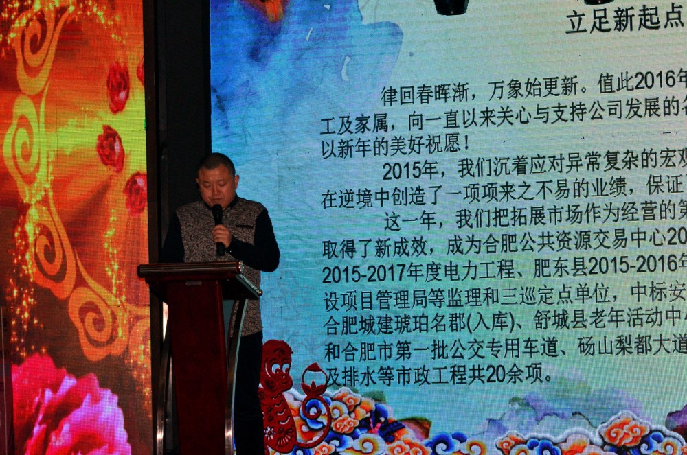 1月30日上午,公司“2016創新.贏天下”主題新年年會在合肥同慶樓舉辦。公司董事長余松林、總經理朱敏、常務副總經理兼總工程師郝傳山以及各巡查組、項目監理部人員參加了年會。