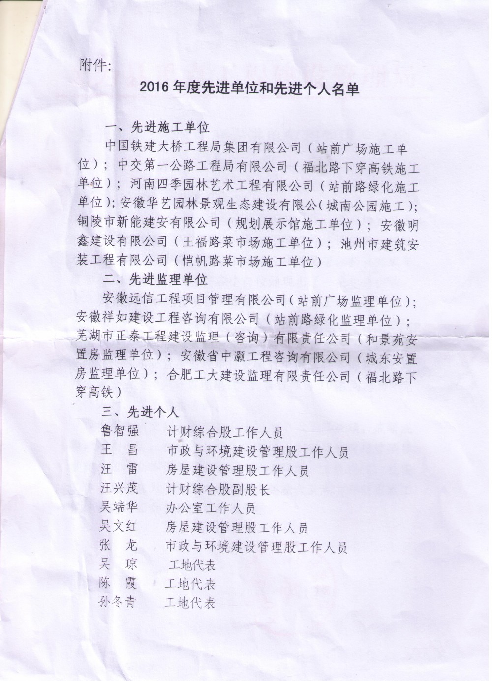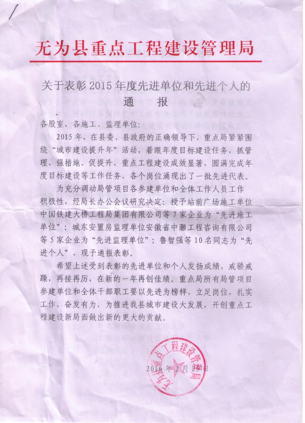 2月29日,無為縣重點工程建設管理局發布《關于表彰2015年度先進單位和先進個人的通報》,授予我公司“先進監理單位”稱號。