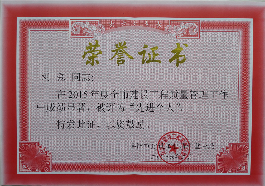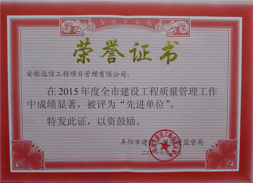 公司作為榜單中上榜的唯一一家監理企業,獲得阜陽市2015年度“建設工程質量管理工作先進單位”榮譽。同時,公司總監劉磊也被授予“建設工程質量管理工作先進個人”稱號。