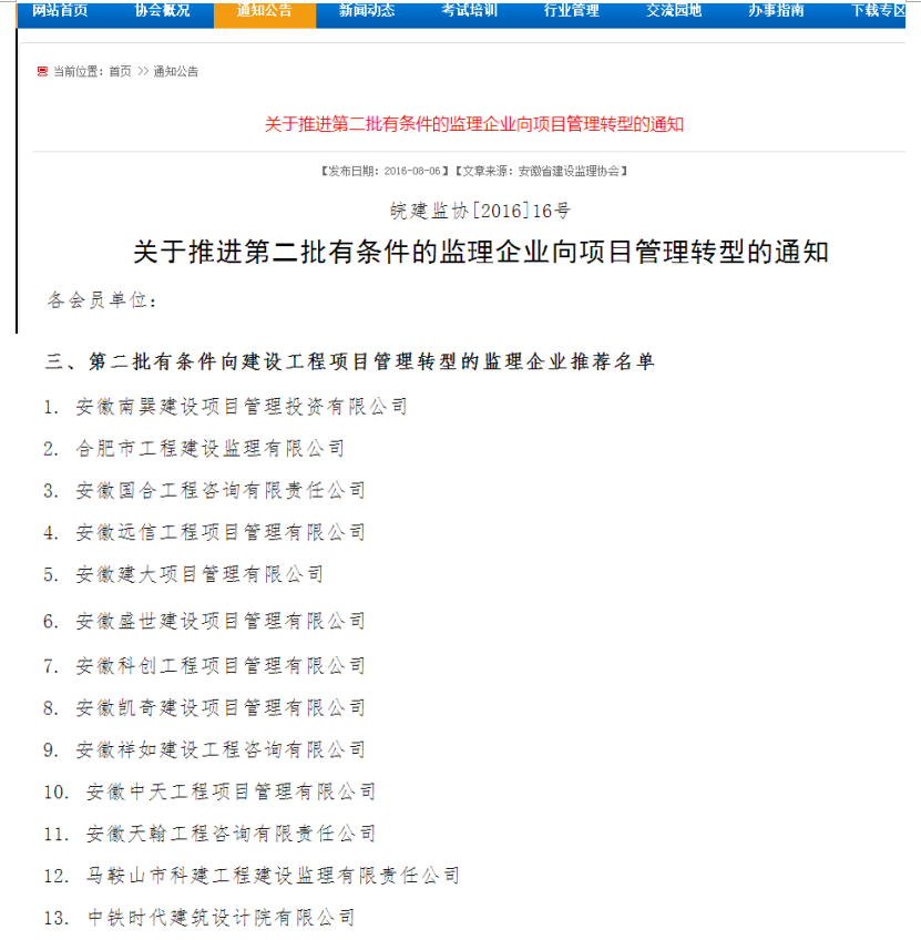 2015年10月,安徽省建設(shè)監(jiān)理協(xié)會(huì)公布了第一批15家有條件向項(xiàng)目管理轉(zhuǎn)型的監(jiān)理企業(yè)后,在全省范圍內(nèi)引起了行業(yè)和各級(jí)政府高度重視,合肥及安慶等地區(qū)在一些公建項(xiàng)目及醫(yī)療衛(wèi)生領(lǐng)域已逐步推廣項(xiàng)目管理(監(jiān)理)招標(biāo)服務(wù)。