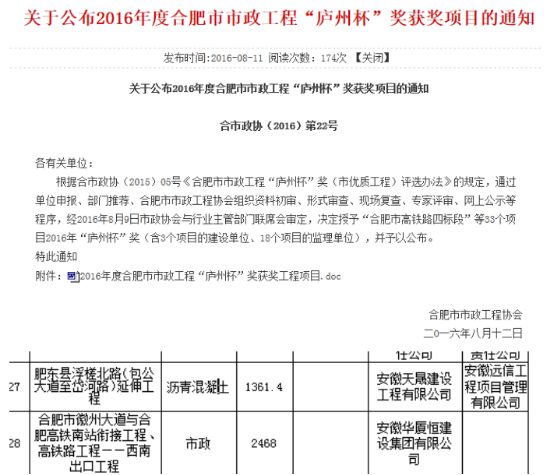 8月12日,合肥市城鄉建設委員會網站公布了2016年“廬州杯”獎(市優質工程)的評獎結果,公司監理的肥東縣浮槎北路(包公大道至岱河路)延伸工程項目名列榜單。
