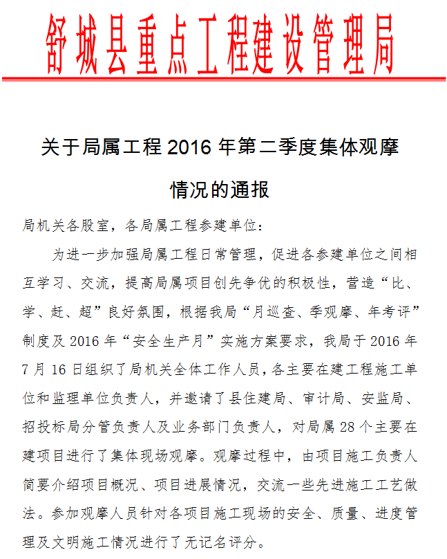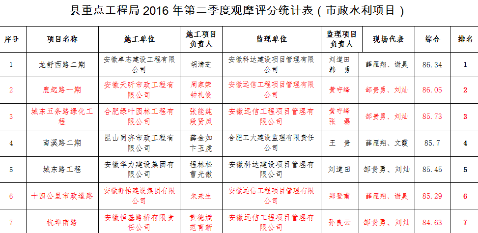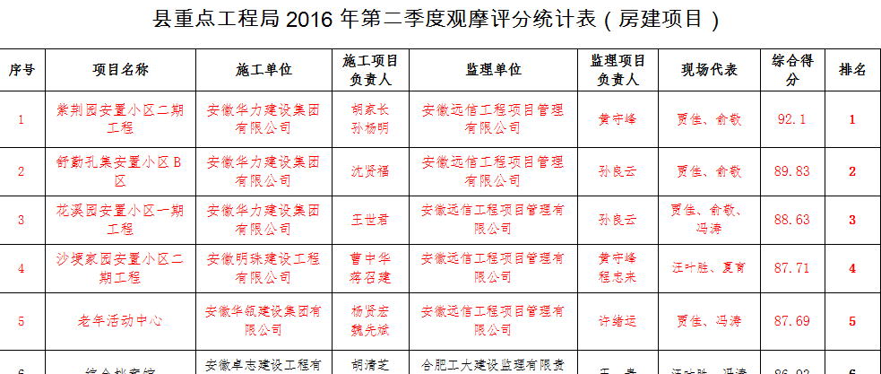 會議對2016年1-7月份局屬重點工程總體情況進行了總結,對“安全生產(chǎn)月”、二季度項目觀摩等工作進行了通報。公司監(jiān)理的房建項目――紫荊園安置小區(qū)二期工程、舒勤孔集安置小區(qū)B區(qū)、花溪園安置小區(qū)一期工程、沙埂家園安置小區(qū)二期工程、老年活動中心工程依次獲得第一、二、三、四、五名的優(yōu)異成績;市政項目――鹿起路一期、城東五條路綠化工程、十四公里市政道路、杭埠南路也榜上有名。