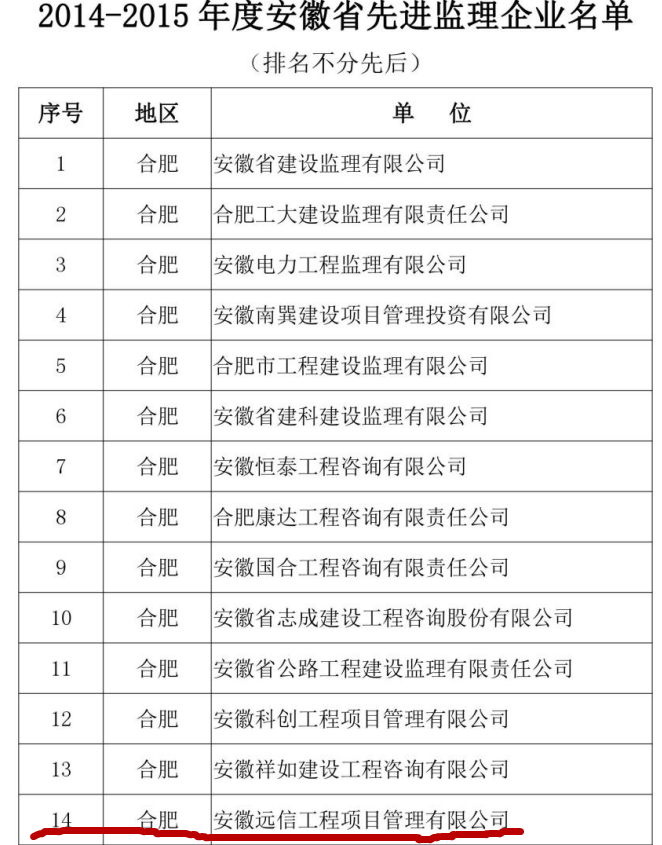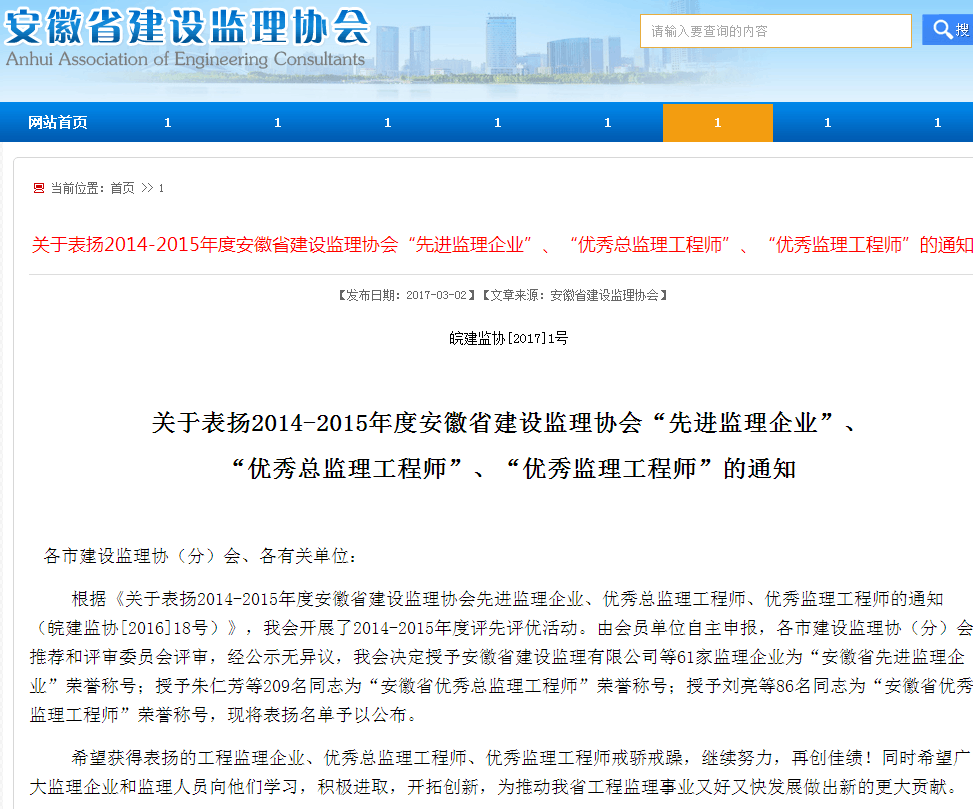 2017年3月2日,安徽省建設監理協會官網發布了《關于表揚2014-2015年度安徽省建設理協會“先進監理企業”、“優秀總監理工程師”、“優秀監理工程師”的通知》文件,公司被授予“安徽省先進監理企業”稱號,同時三名總監張勇、趙賢禮、翟榮春被授予“安徽省優秀總監理工程師”稱號。