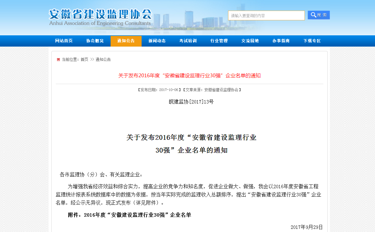 10月6日,安徽省建設監理協會網站發布2016年度“安徽省建設監理行業30強”企業名單,安徽遠信再次入圍30強企業名單(排名第18位)。同時,也是自2013年公司上榜以來,連續4年穩居全省監理行業TOP20榜單。
