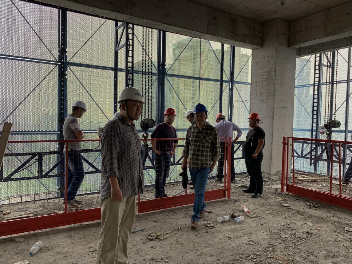在現(xiàn)場觀摩環(huán)節(jié),黃健等領(lǐng)導(dǎo)參觀了全鋼式升降腳手架的施工層現(xiàn)場、物料平臺、防墜落裝置、導(dǎo)向防傾翻裝置等,并認(rèn)真聽取了架體解說答疑,參與觀摩人員對全鋼式升降腳手架的管理工作給予了一致好評。