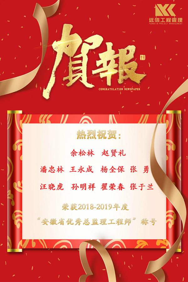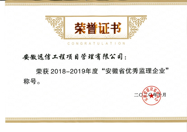 近日,從安徽省建設(shè)監(jiān)理協(xié)會傳來喜訊,安徽遠信被授予2018-2019年度“安徽省優(yōu)秀監(jiān)理企業(yè)”榮譽稱號,這是繼2012年以來連續(xù)第4次獲得該項榮譽。同時,趙賢禮等10人榮獲“安徽省優(yōu)秀總監(jiān)理工程師”稱號。