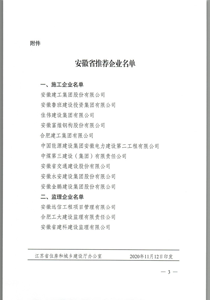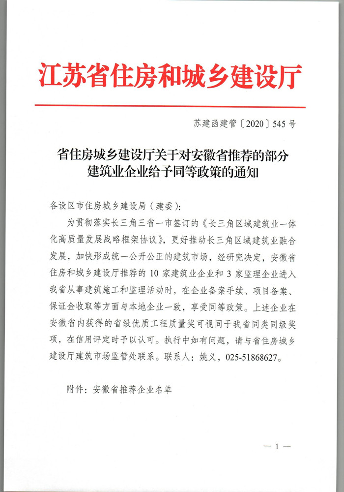 近日,江蘇省住房和城鄉建設廳發布《省住房城鄉建設廳關于對安徽省推薦的部分建筑業企業給予同等政策的通知》(蘇建函建管[2020]545號),準予安徽遠信在內的3家監理企業及10家建筑業企業在企業備案手續、項目備案、保證金收取等方面,享受與當地企業同等政策。