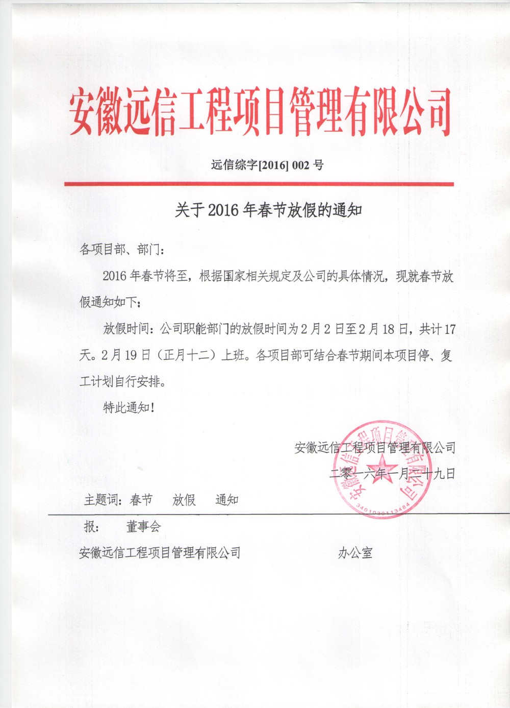 關于2016年春節放假的通知 發布時間:2016-01-28 閱讀量:3859 上一篇:關于在公司內部公開征求《廉潔管理辦法》(征求意見稿)意見的通知下一篇:關于再次重申禁止員工騎摩托車、電動車上下班的通知