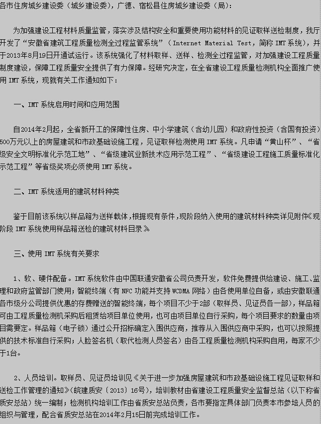 關于在全省建設工程質量檢測機構推廣使用安徽省建筑工程質量檢測全過程監管系統的通知 發布時間:2014-06-17 閱讀量:2085 上一篇:安徽省住房城鄉建設廳轉發住房城鄉建設部辦公廳關于組織開展全國建設工程質量安全監督執法檢查的通知下一篇:關于進一步加強房屋建筑和市政基礎設施工程見證取樣和送檢工作管理的通知(轉發)