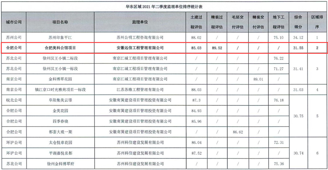 品質(zhì)守望,嚴把質(zhì)量。近日,金科股份集團華東區(qū)域2021年二季度監(jiān)理單位排序統(tǒng)計表出爐。安徽遠信工程項目管理有限公司位列金科地產(chǎn)華東區(qū)域公司監(jiān)理單位綜合排序第二名。