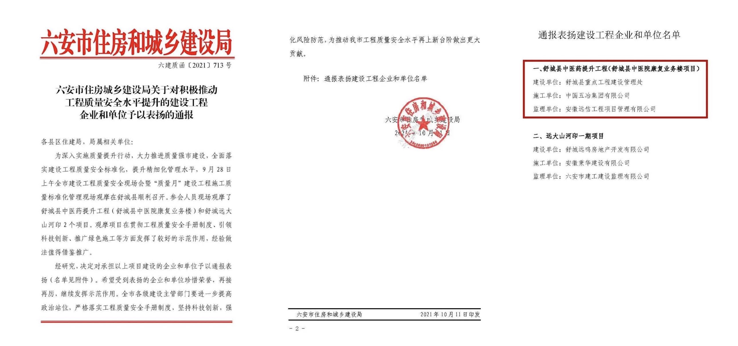 10月11日,安徽遠(yuǎn)信監(jiān)理的舒城縣中醫(yī)藥提升工程項(xiàng)目收到來(lái)自六安市住房和城鄉(xiāng)建設(shè)局的通報(bào)表?yè)P(yáng)。