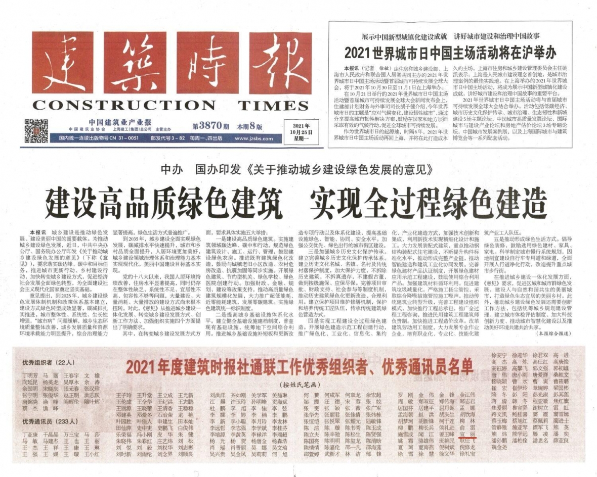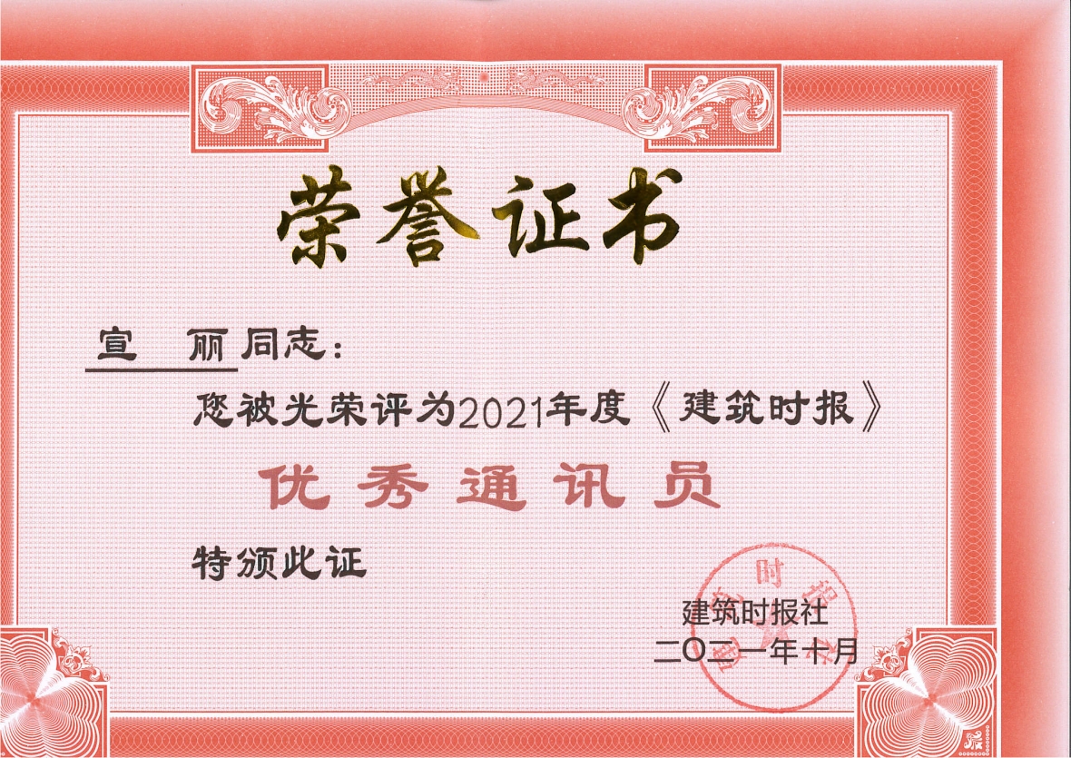 公司通聯(lián)部宣麗獲評(píng)2021年度《建筑時(shí)報(bào)》全國優(yōu)秀通訊員稱號(hào)