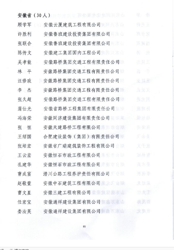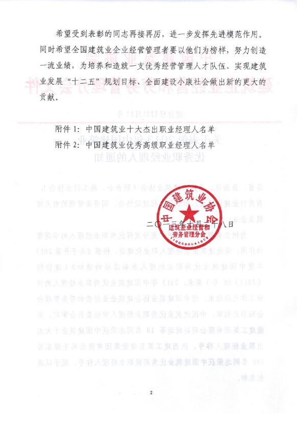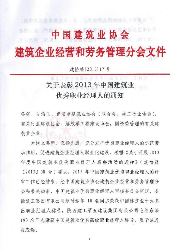 近日,由中國建筑業協會建筑企業經營與勞務管理分會行文,表彰2013年中國建筑業優秀高級職業經理人,全國共有190名同志(安徽省共有30人)榮獲“中國建筑業優秀高級職業經理人”稱號,我公司常務副總經理朱敏獲此殊榮。
